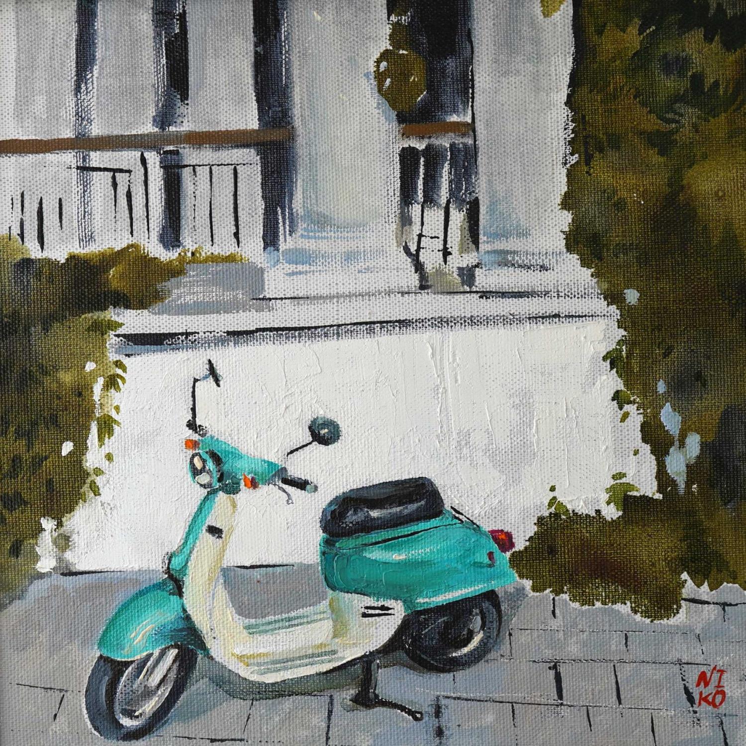 Pintura Paris 46 - Scooter blanc por Niko Marina  | Pintura Figurative Urban Oil