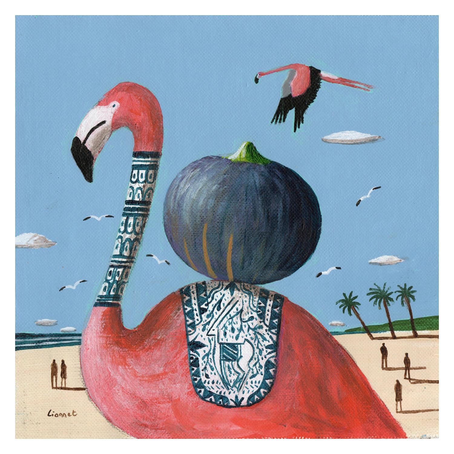 This unique and original contemporary artwork "Flamant à la grenade" on the subjects of Animals, Marine, Life style has been created by the contemporary artist Lionnet Pascal.