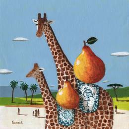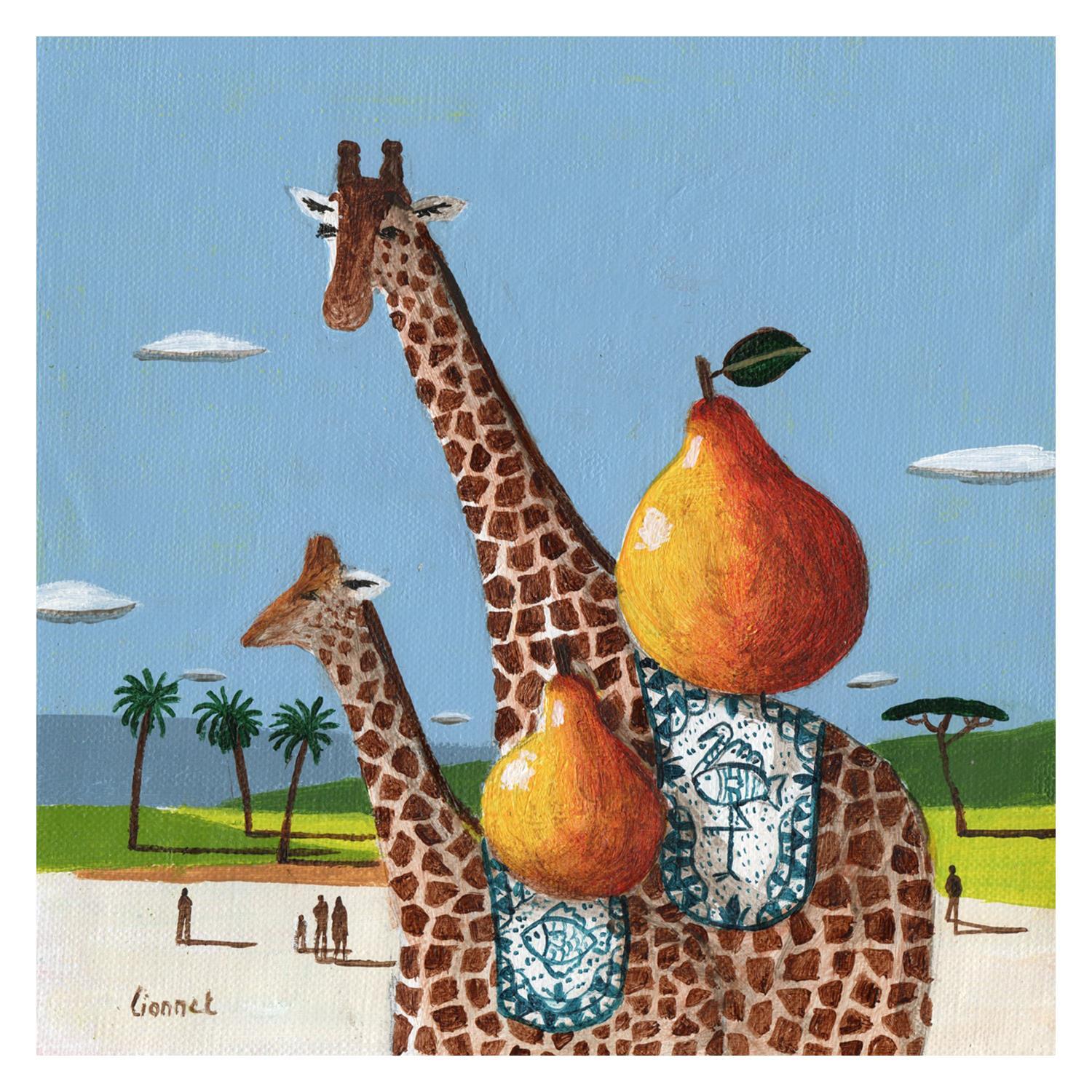 This unique and original contemporary artwork "Girafes aux poires" on the subjects of Animals, Landscapes, Life style has been created by the contemporary artist Lionnet Pascal.