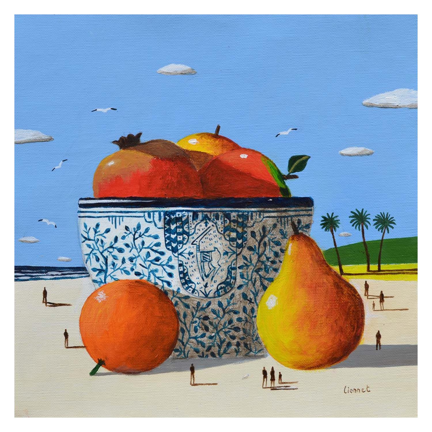 This unique and original contemporary artwork "Fruits sur la plage" on the subjects of Life style, Marine, Still-life has been created by the contemporary artist Lionnet Pascal.