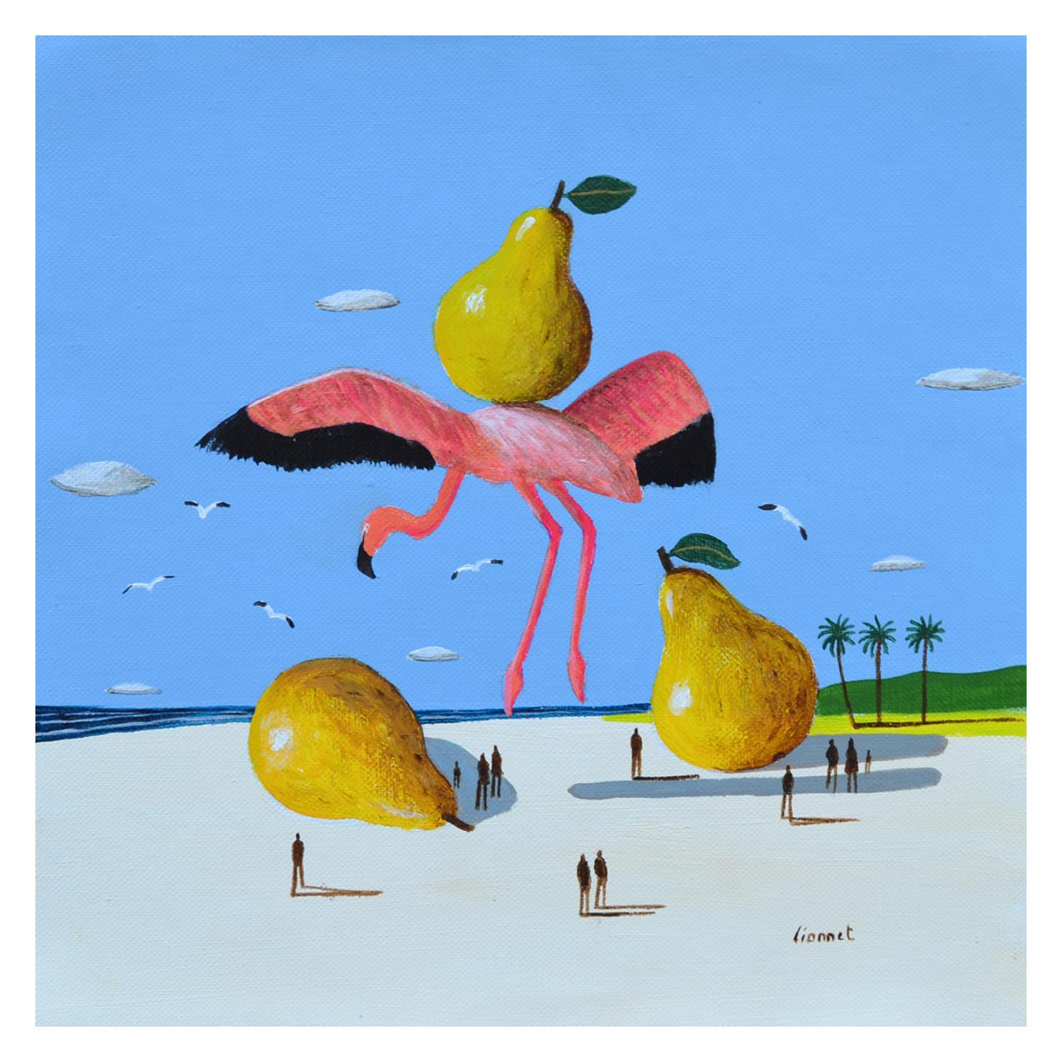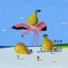 This unique and original contemporary artwork "Flamant rose aux poires" on the subjects of Animals, Marine, Still-life has been created by the contemporary artist Lionnet Pascal.