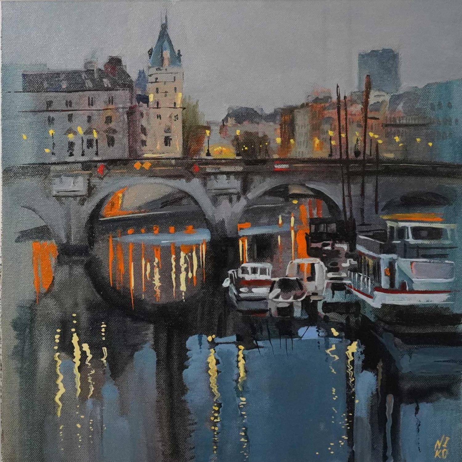 Pintura Reflections of the evening city por Niko Marina  | Pintura Figurative Urban Oil