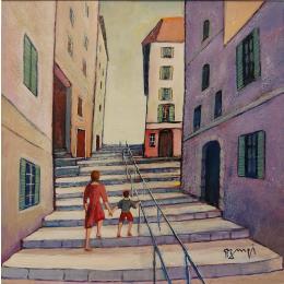 This unique and original contemporary artwork "Montée des Accoules AQ134" on the subjects of Landscapes, Life style, Urban has been created by the contemporary artist Burgi Roger.