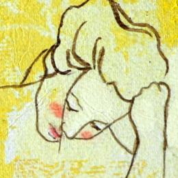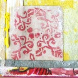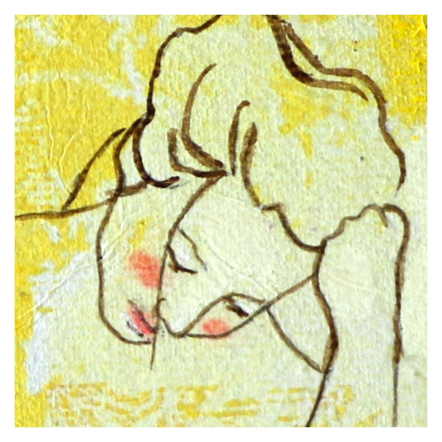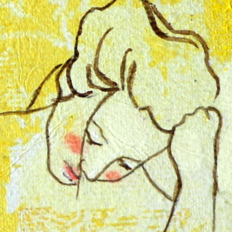 The artist used a mixed technique of ink, acrylic, stamping, upcycling and collage art to create this small-format painting on canvas and wood in the Art Singulier style.
