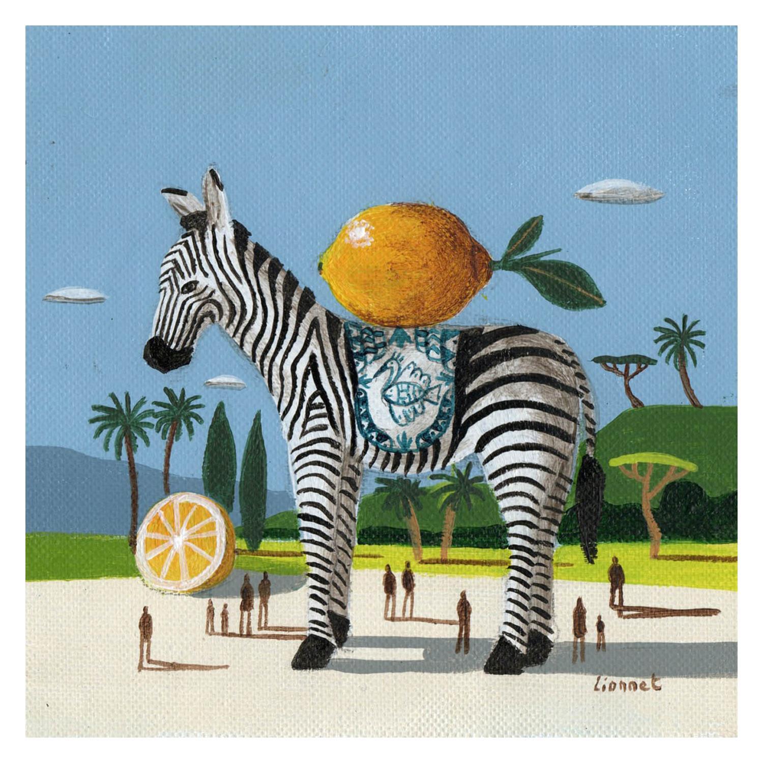 This unique and original contemporary artwork "Zèbre aux citrons" on the subjects of Animals, Landscapes, Life style has been created by the contemporary artist Lionnet Pascal.