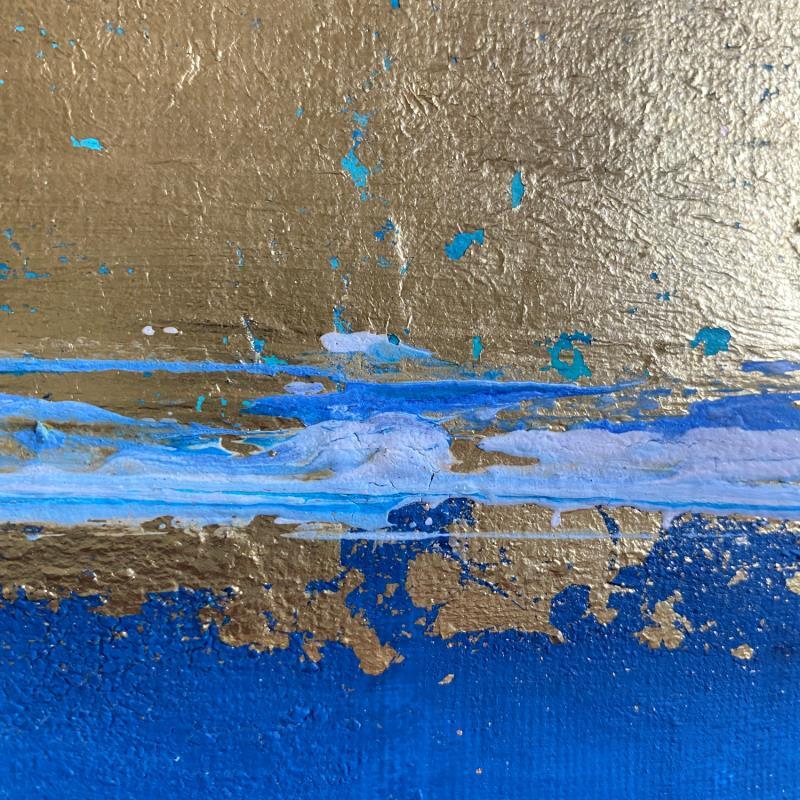The artist used acrylics and gold leaf to create this small-format painting on canvas in a semi-abstract style.