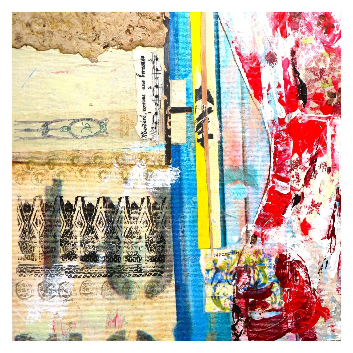The artist used a mixed media technique of ink, acrylic, collage, stamping, relief carving and upcycling to create this large-format canvas on wood painting in the Art Singulier style.