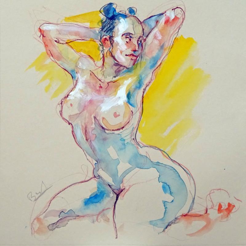 The artist used the watercolor technique to create this small-format painting on paper in the figurative nude style.
