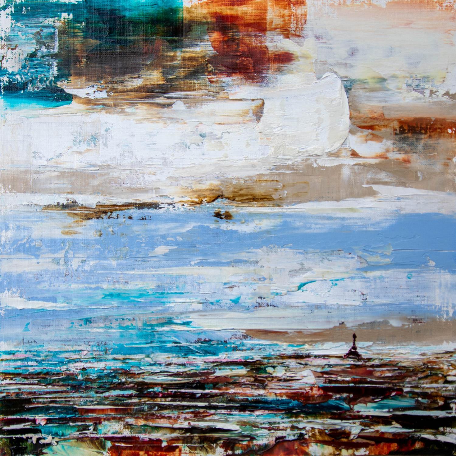 Paris" represents the city in a metaphorical, non-figurative way. She chooses an overhanging vantage point to highlight the capital's rooftops, whose reliefs and ridges create an undulating, almost maritime movement, accentuated by the liquidity of the paint. The motif is painted in oil and palette knife, playing on oppositions between warm (shades of red) and cool (shades of blue and green) colors. The proportions of the painting, two-thirds of which is dominated by the sky, are designed to accentuate the perspective and majesty of the motif. The sky, moreover, echoes the opposition between cold (left) and warm (right) hues, the two masses being linked by the stringy, torn clouds that give depth to the space.