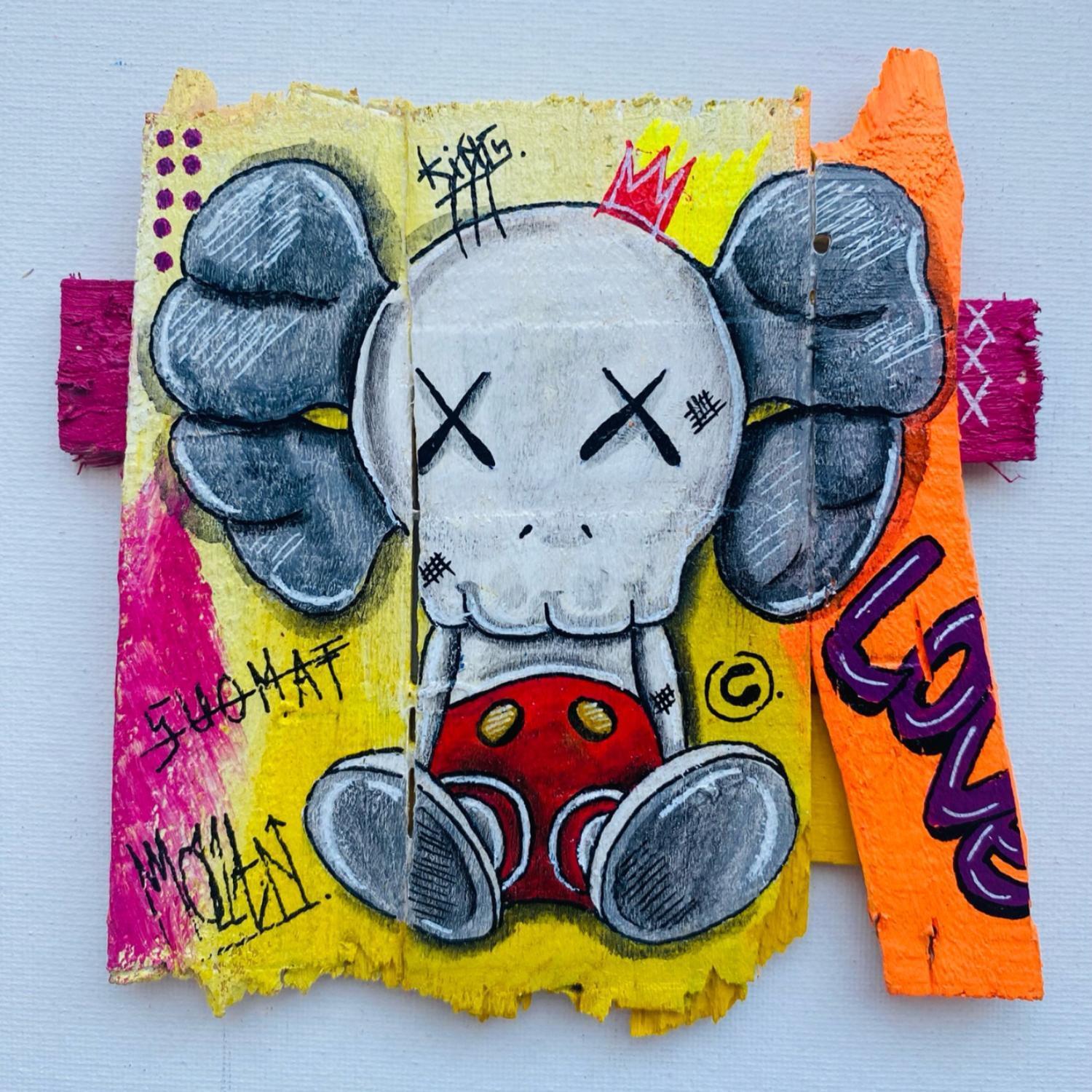 The artist used Acrylic, Wood, Posca media on Wood to create this Pop-art, Small size painting.