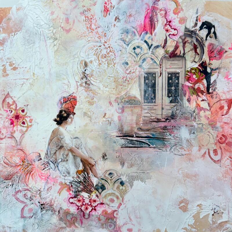 The artist used mixed media: collages, textures, fabrics, pastels and acrylic paint, to create this small-format painting on soft canvas in an abstract, surrealist style.