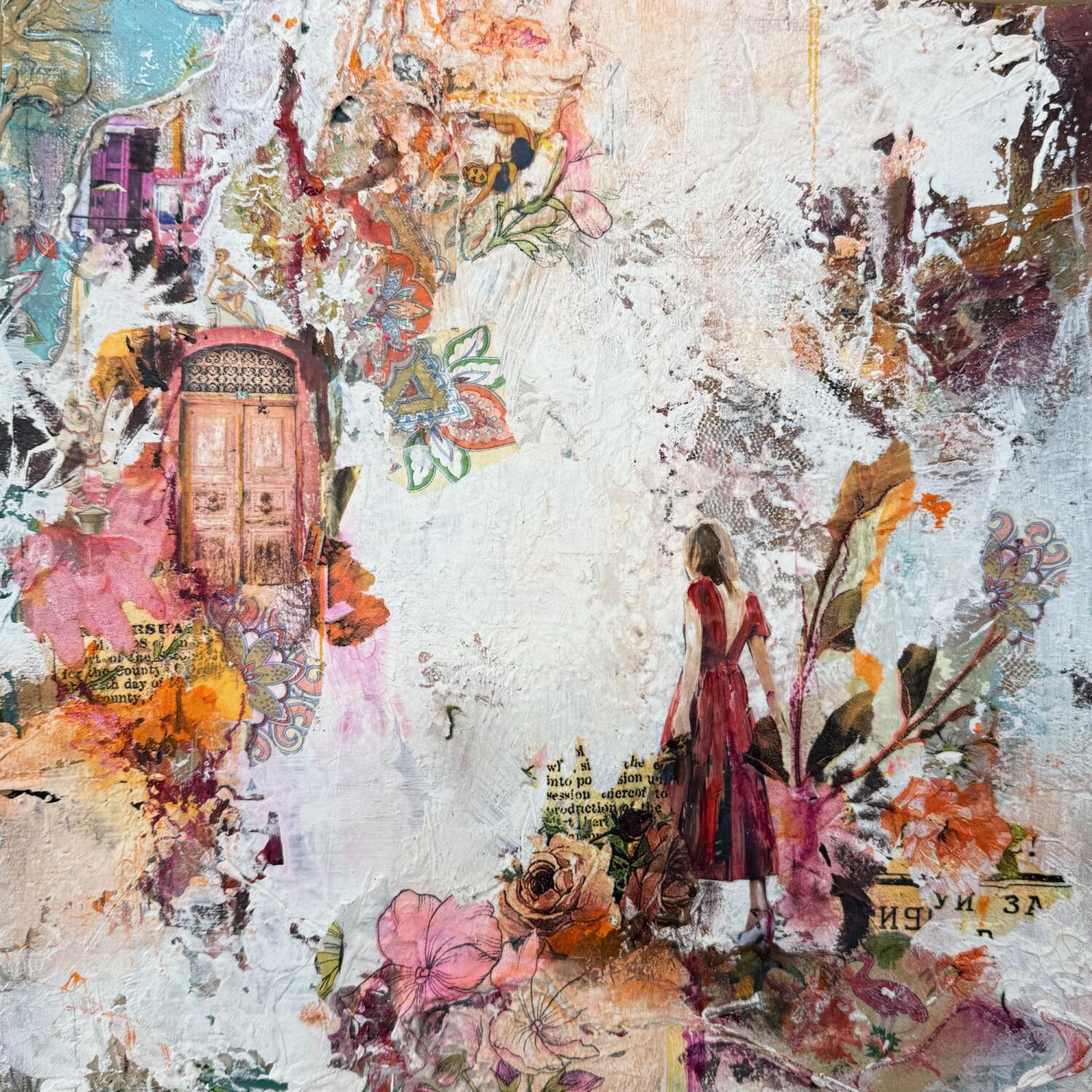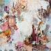 The artist used mixed media: collages, textures, fabrics, pastels and acrylic paint, to create this small-format painting on soft canvas in an abstract, surrealist style.