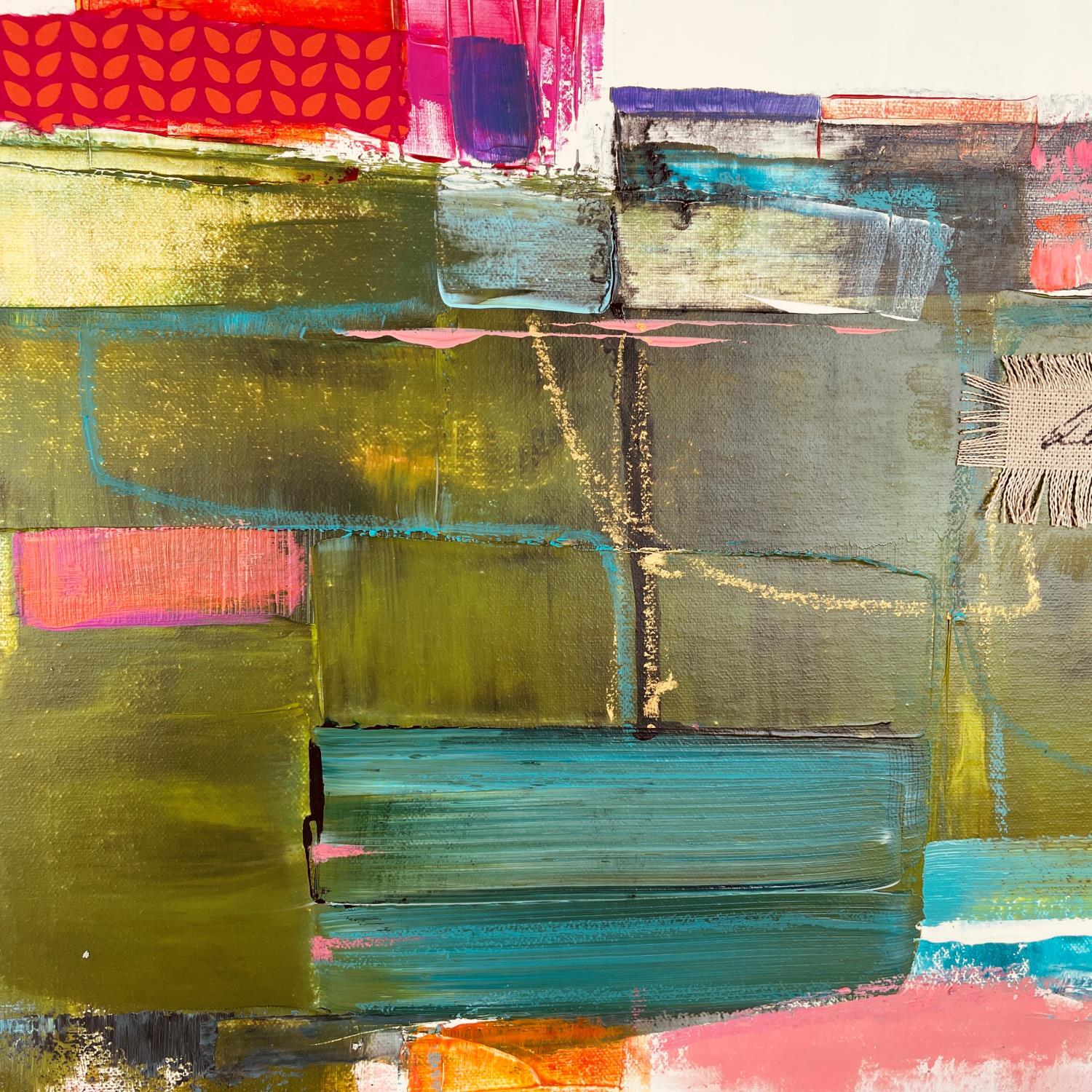 The artist used Acrylic, Gluing, Gold leaf, Paper, Pastel media on Canvas to create this Abstract, Large size painting.
