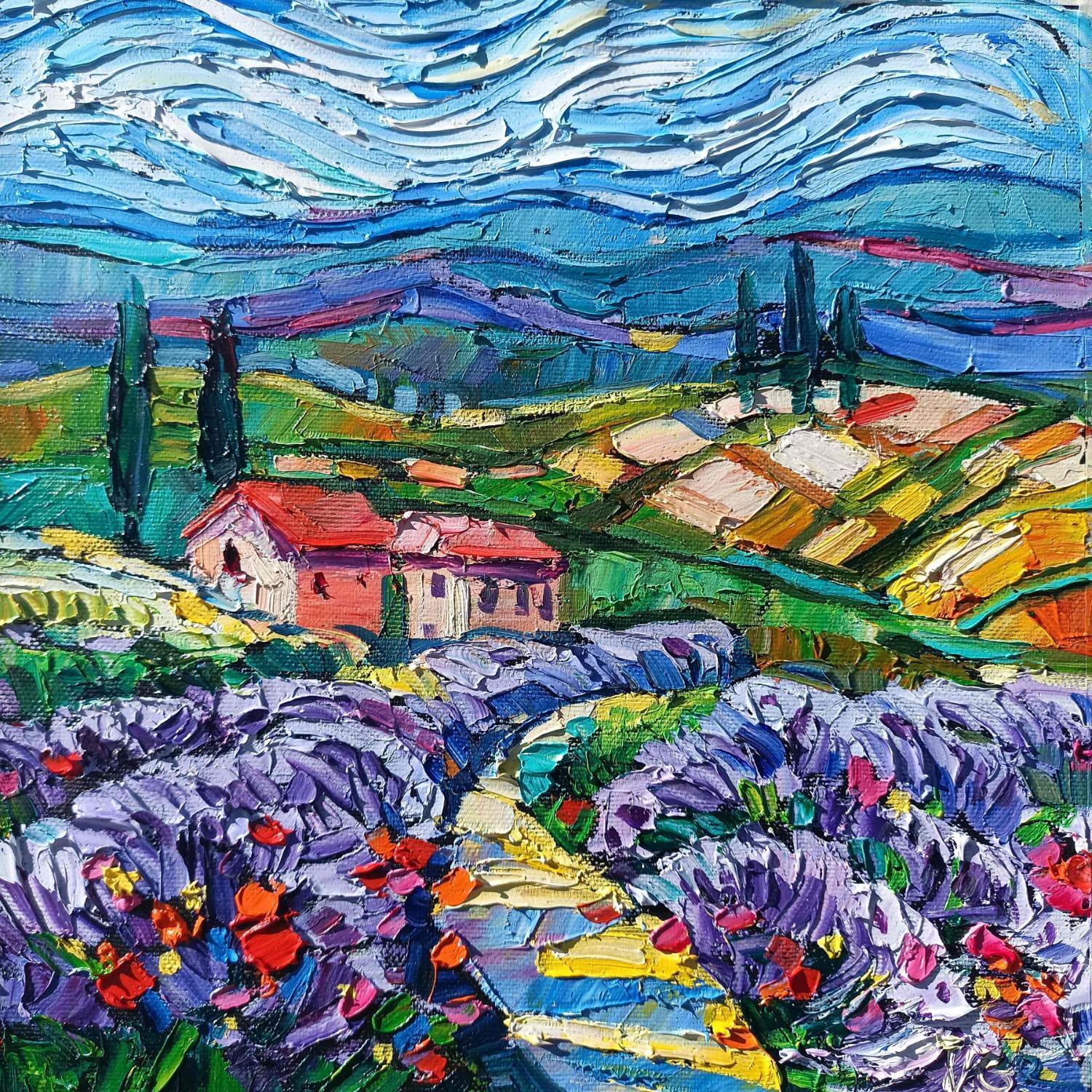 This unique and original contemporary artwork "Lavender and the hills" on the subject of Landscapes has been created by the contemporary artist Georgieva Vanya.