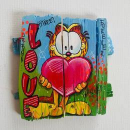 The artist used Acrylic, Wood, Posca media on Wood to create this Pop-art, Small size painting.