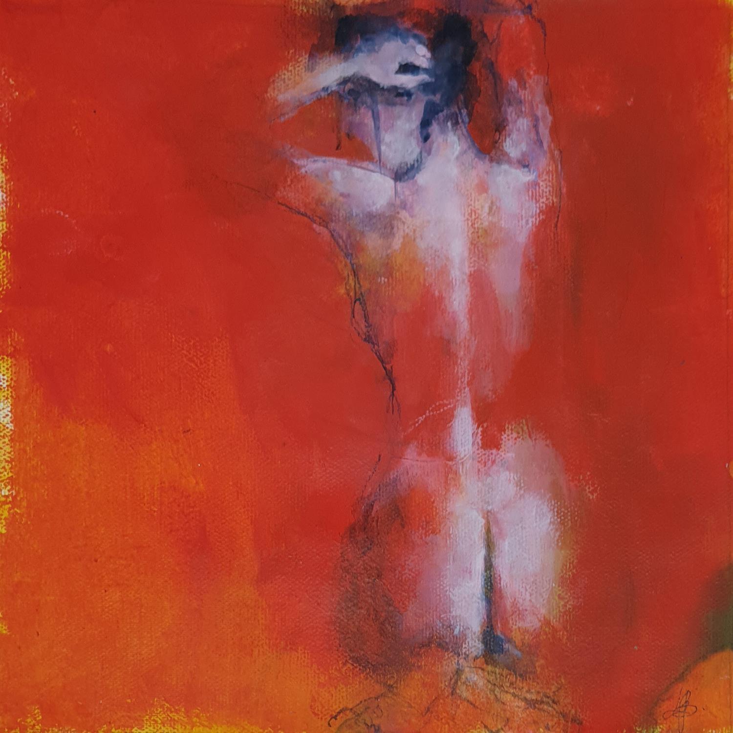 This small acrylic painting on canvas is a vibrant, expressive work, depicting a female silhouette against an intense red background. The figure, sketched with flowing lines and touches of contrasting colors, stands out with elegance and mystery. Shades of white and black add depth and drama to the composition.