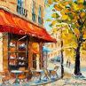 This small oil painting by Diana Pigni, titled "Café Corner Breeze," beautifully captures a cozy street scene in Paris. Measuring 13 by 13 cm, the artwork is painted in oil on canvas with thick textures using a palette knife. The vibrant colours and rich details bring to life a charming outdoor café with tables and chairs under a red awning, set against the backdrop of a sunny street lined with leafy trees. Hand-painted with care, this piece brings a warm and inviting atmosphere.