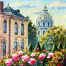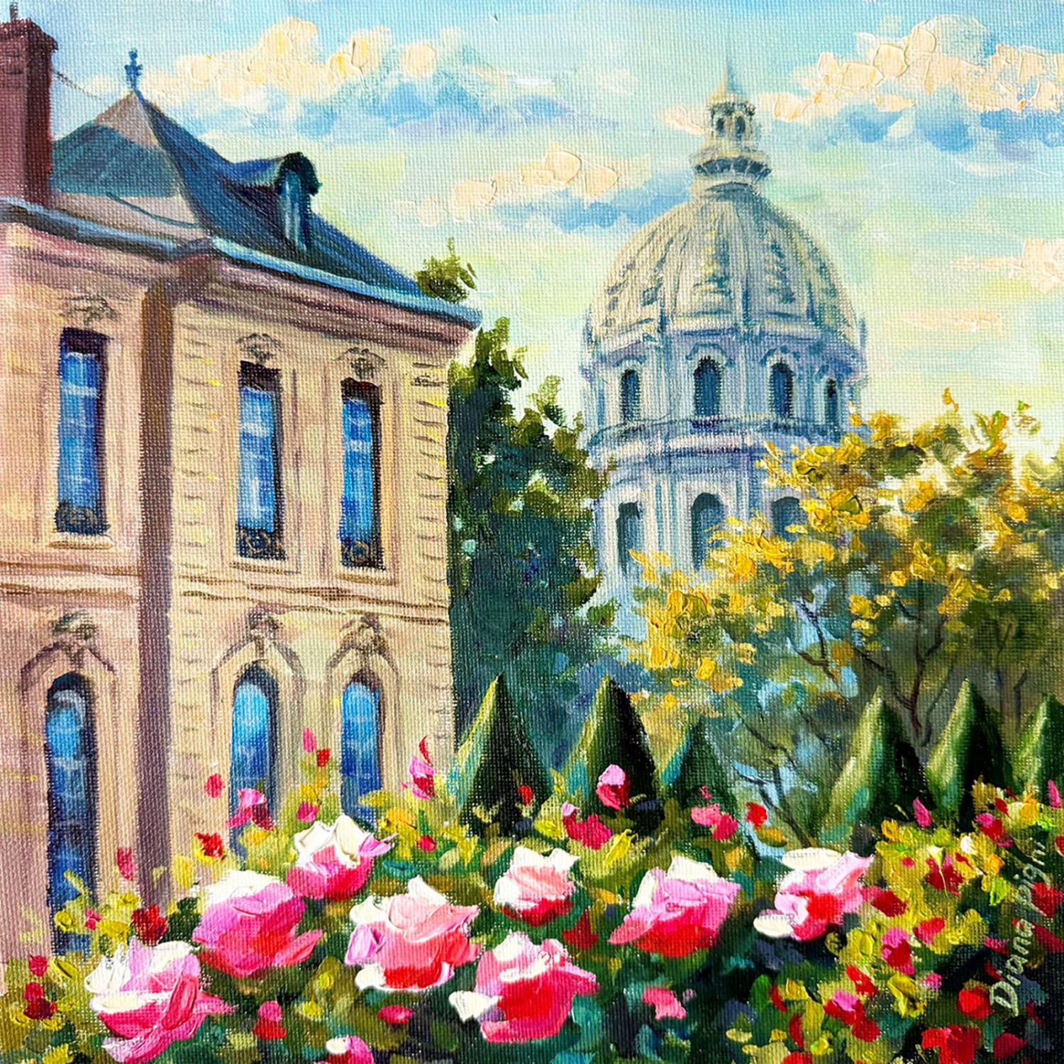 This hand-painted oil on canvas (25x25 cm) by Diana Pigni of the Musée Rodin elegant garden, filled with blooming pink roses, with the striking Dôme des Invalides in the background, adding a sense of grandeur and timelessness. The soft golden light, lush greenery, and delicate floral details create a serene and romantic atmosphere, perfectly complementing the museum’s artistic legacy. The thick textures and expressive brushstrokes enhance the painting's vibrancy, making it a captivating piece filled with Parisian charm.