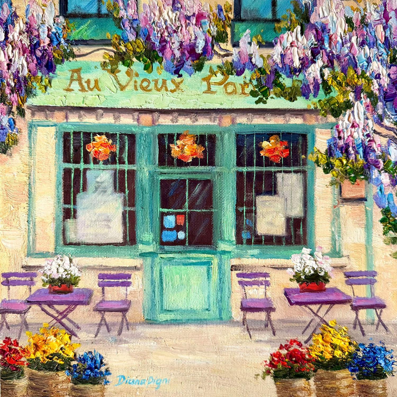 A hand-painted oil on canvas (25x25 cm) by Diana Pigni, this artwork transports the viewer to a dreamy Parisian café adorned with cascading wisteria and vibrant floral arrangements. The soft pastel hues of the storefront, accented by elegant wrought-iron details and cosy seating, evoke a sense of warmth and nostalgia. The impasto brushstrokes add depth and texture, making the scene feel alive, as if inviting you to sit down and enjoy a quiet moment in the heart of Paris.
