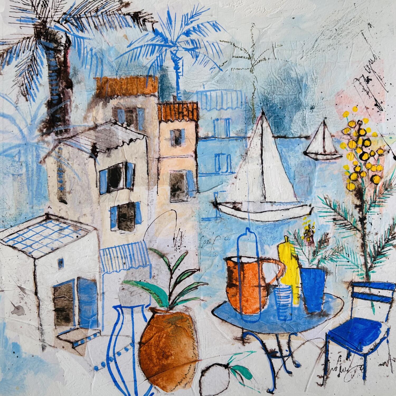 This unique and original contemporary artwork "Terrasse aux mimosas" on the subjects of Landscapes, Marine, Nature has been created by the contemporary artist Colombo Cécile.