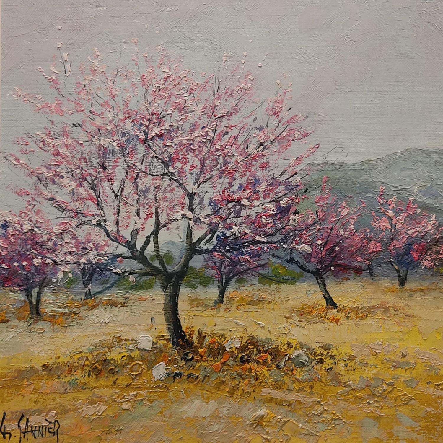 This unique and original contemporary artwork "Pêchers en fleurs" on the subject of Landscapes has been created by the contemporary artist Sannier Daniel.