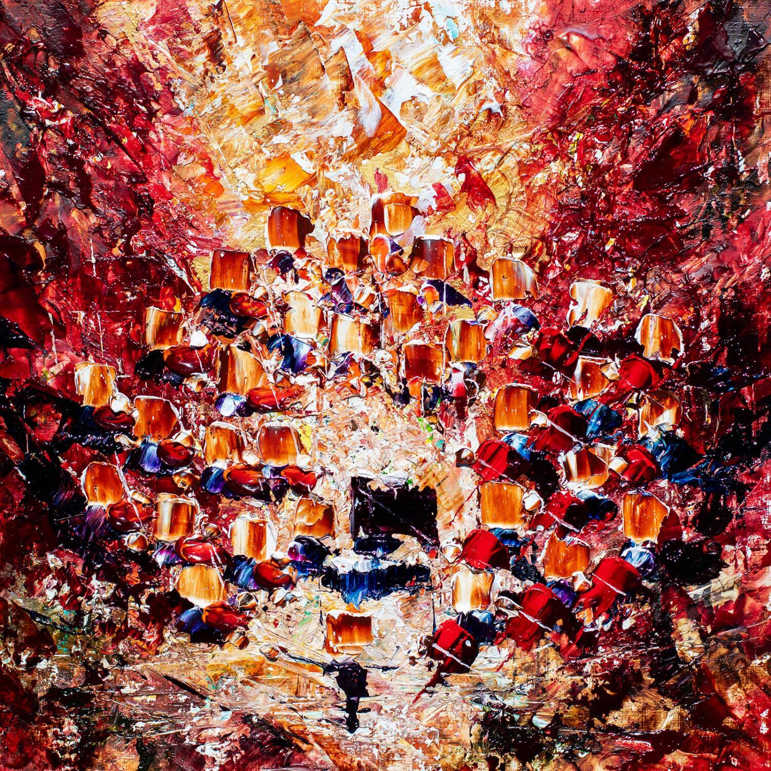 Le concert avec pianiste is a work that oscillates between abstraction in the periphery and naive art in the center and the representation of the instrumentalists. The motif is painted in knife and oil, and plays on a harmony of warm colors (shades of red, orange) and metallics (gold, copper, silver...). The square heads of the figures are inspired by Nicolas de Staël's "Parc des Princes" series. The staging highlights the central pianist, playing on circularity (the formation) and verticality (the background). The conductor, isolated and in a masterly posture, concludes the lower part of the work. The overall tone is flamboyant or baroque... depending on your sensibilities.