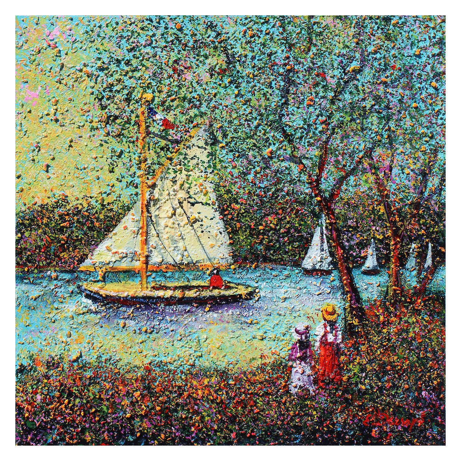 The artist used Acrylic and Sand techniques to create this small-format Impressionist-style painting on canvas.