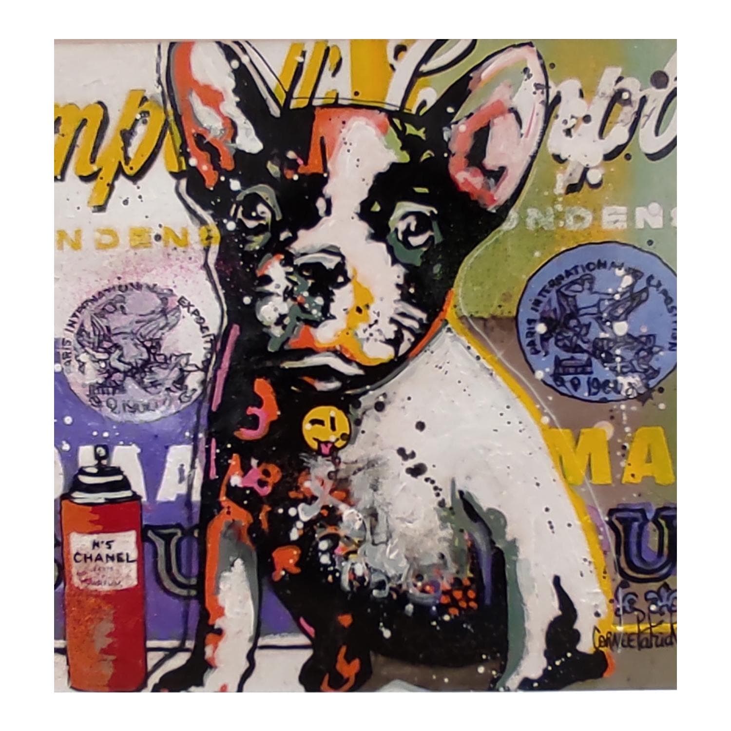 This unique and original contemporary artwork "My French Bulldog likes Campbell's soup" on the subject of Animals has been created by the contemporary artist Cornée Patrick.
