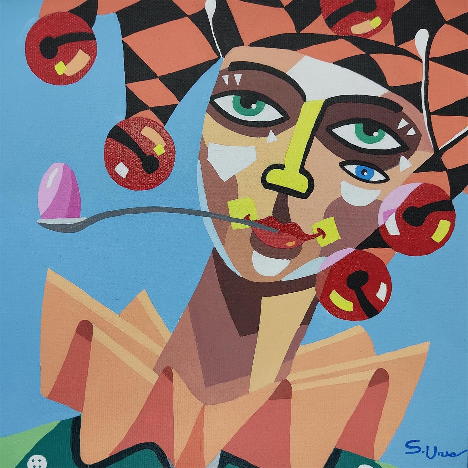 This unique and original contemporary artwork "ARLEQUIN CON HUEVO" on the subject of Portrait has been created by the contemporary artist S.Uria.