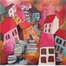 This unique and original contemporary artwork "Paysage aux maisons roses" on the subject of Life style has been created by the contemporary artist Fauve.