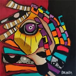 Karla Gorigoitia is a Chilean artist. Thanks to her studies in Plastic and Dramatic Arts, she fuses these fields and uses theatrical techniques to give life to different characters, diverting them and creating masks. Interested in color, matter and paper tearing, the artist combines acrylic, collage and writing in her pictorial compositions. Each of her canvases can be seen as a play, with the text hidden behind the colors. She has exhibited in Europe, the United States, Latin America and China.