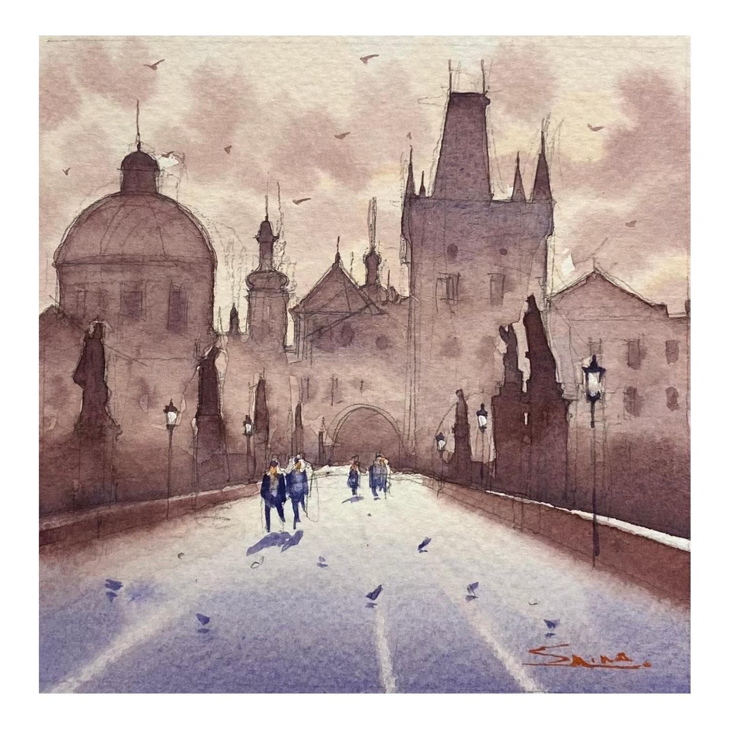 Winter Morning, PraguePintura Winter Morning, Prague por Dandapat Swarup | Pintura Figurative Urban Life style Watercolor