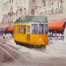 This unique and original contemporary artwork "A Tram Ride" on the subject of Urban has been created by the contemporary artist Dandapat Swarup.