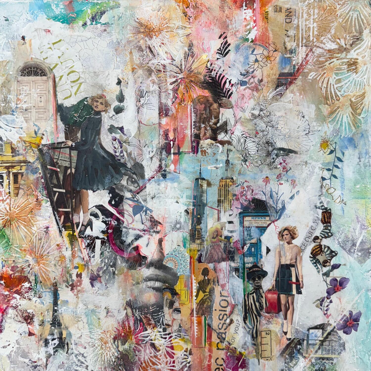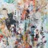 L'artiste a utilisé les techniques mixtes: collages, textures, tissus, pastels et la peinture acrylique, pour créer cette peinture petit format sur toile souple de style abstrait, surréaliste.