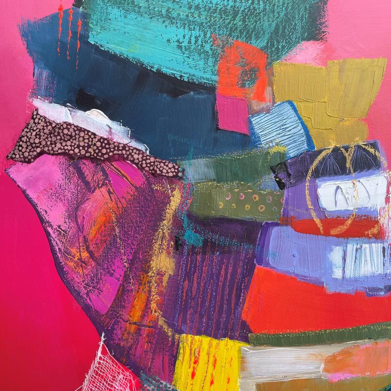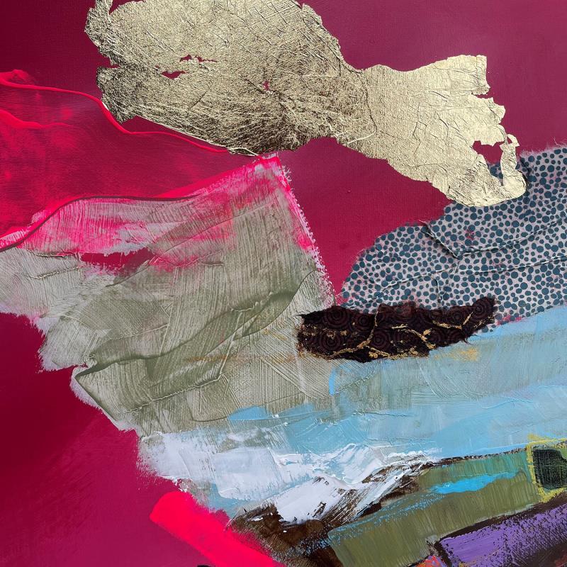 L'artiste a utilisé les techniques Acrylique, Collage, Feuille d'or, Papier, Pastel pour créer cette peinture grand format sur Toile de style Abstrait.
