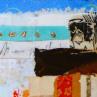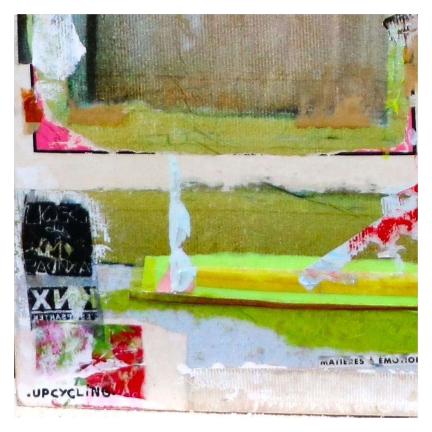 L'artiste a utilisé la technique mixte, Encre, Acrylique, upcycling, photo, collage, estampage pour créer cette peinture grand format toile sur Bois de style Art Singulier.