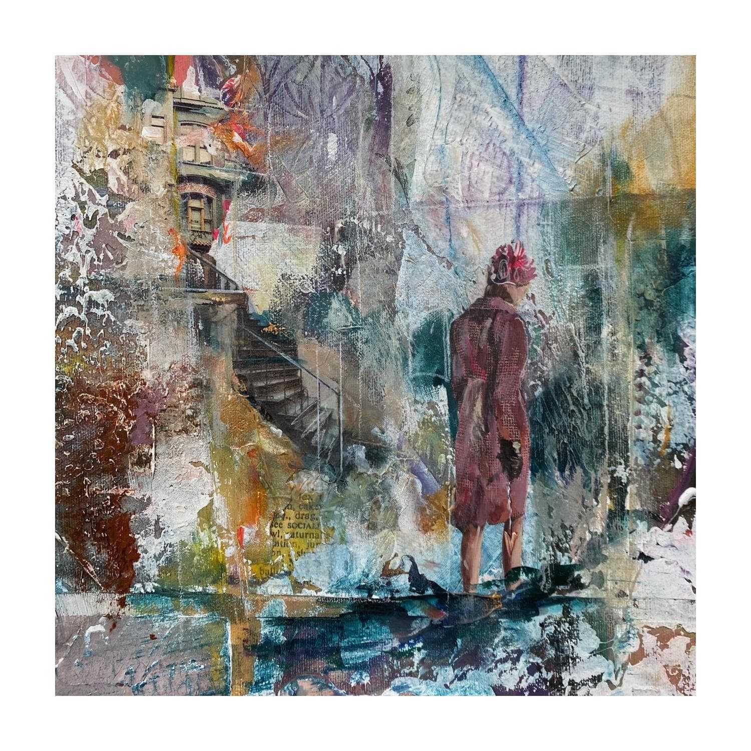 L'artiste a utilisé les techniques Collage, Huile, Acrylique pour créer cette peinture petit format sur toile de style Figuratif sur le thème scènes de vie.