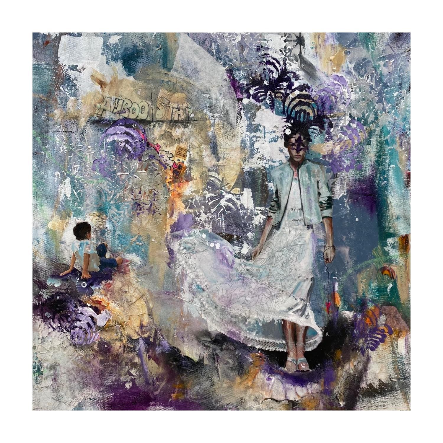 L'artiste a utilisé les techniques Collage, Huile, Acrylique pour créer cette peinture petit format sur toile de style Figuratif sur le thème scènes de vie.