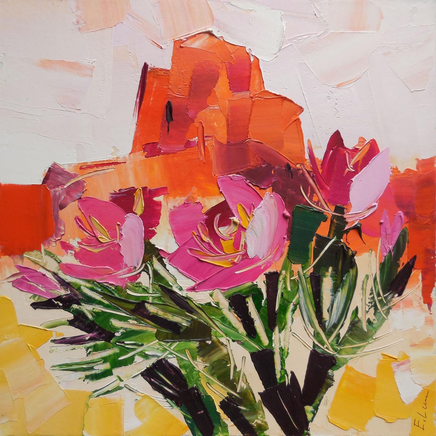 Cette œuvre d'art contemporain unique et originale intitulée "Cholla cactus and red Rocks" a été créée par l'artiste contemporaine Lunetskaya Elena.