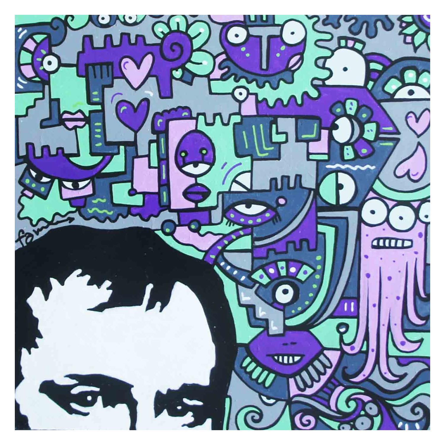 L'artiste a utilisé la technique mixte pour créer cette peinture petit format sur bois de style Pop-art.