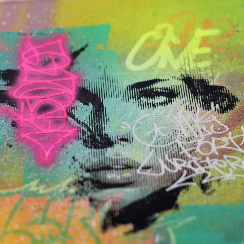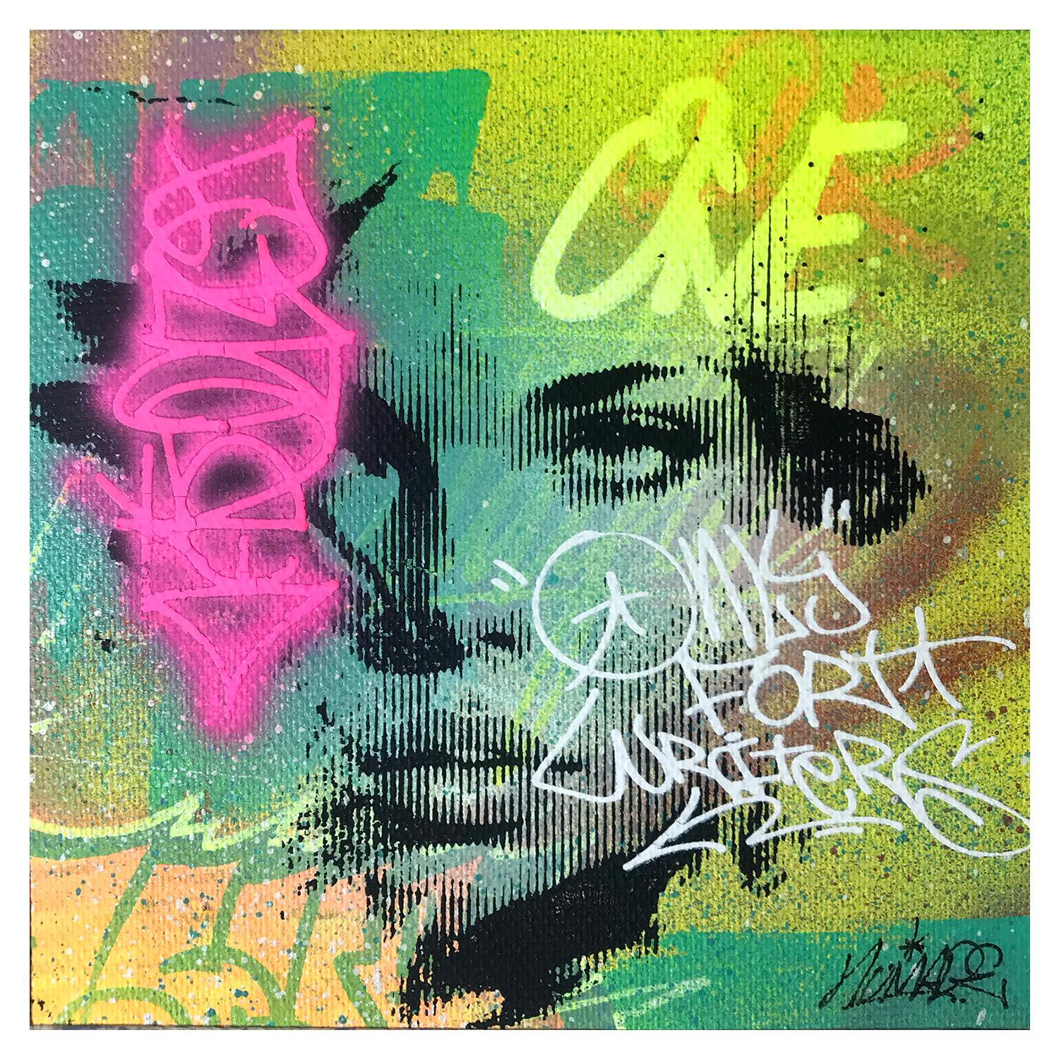 L'artiste a utilisé les techniques Acrylique, Graffiti pour créer cette peinture petit format sur Toile de style Street Art.