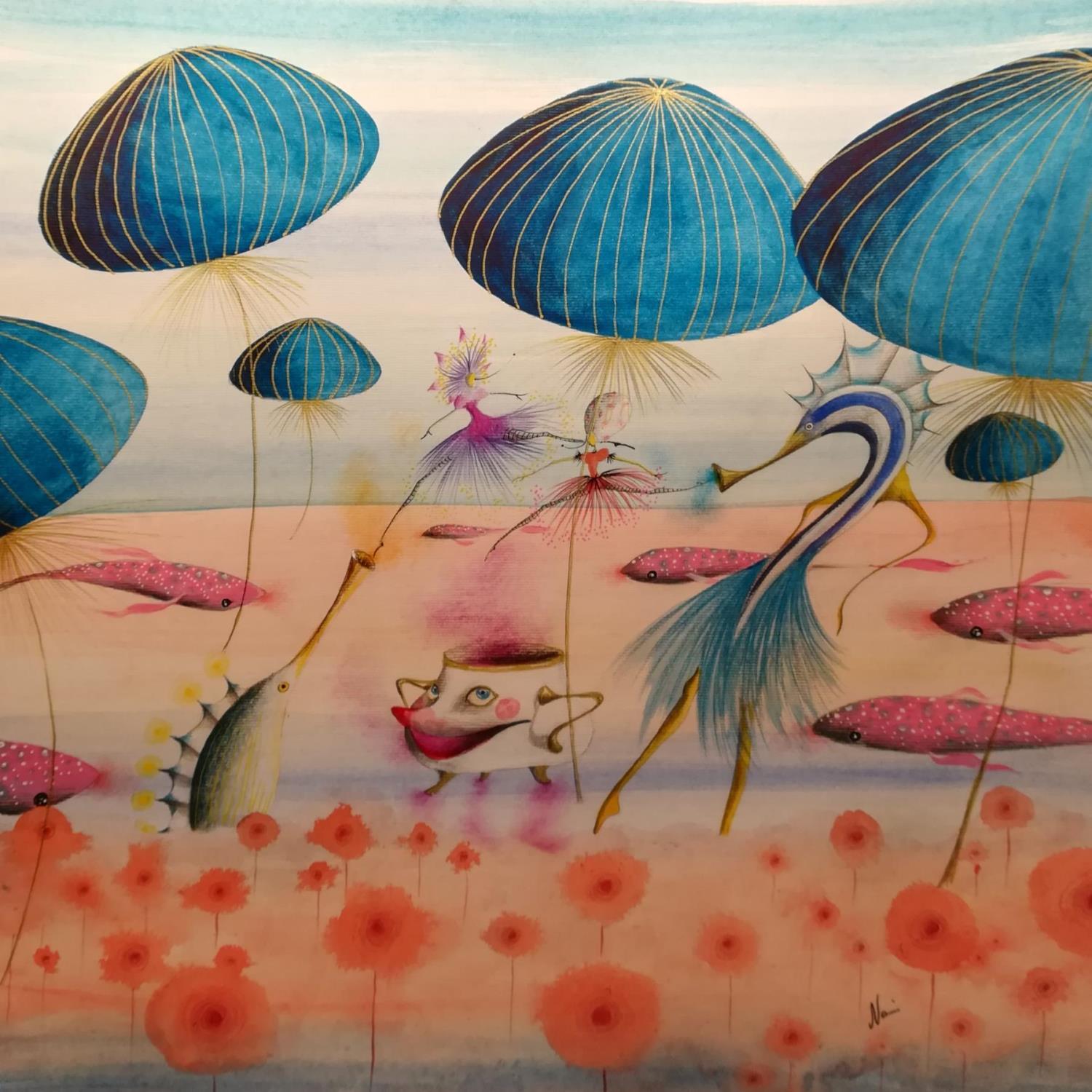 L'artiste a utilisé les techniques Acrylique, Collage pour créer cette peinture petit format sur Papier de style Surréalisme sur les thèmes Animaux, Marine, Musique.