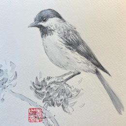 L'artiste a utilisé les techniques Aquarelle, Encre pour créer cette peinture petit format sur Papier de style Figuratif sur les thèmes Animaux, Noir & blanc.