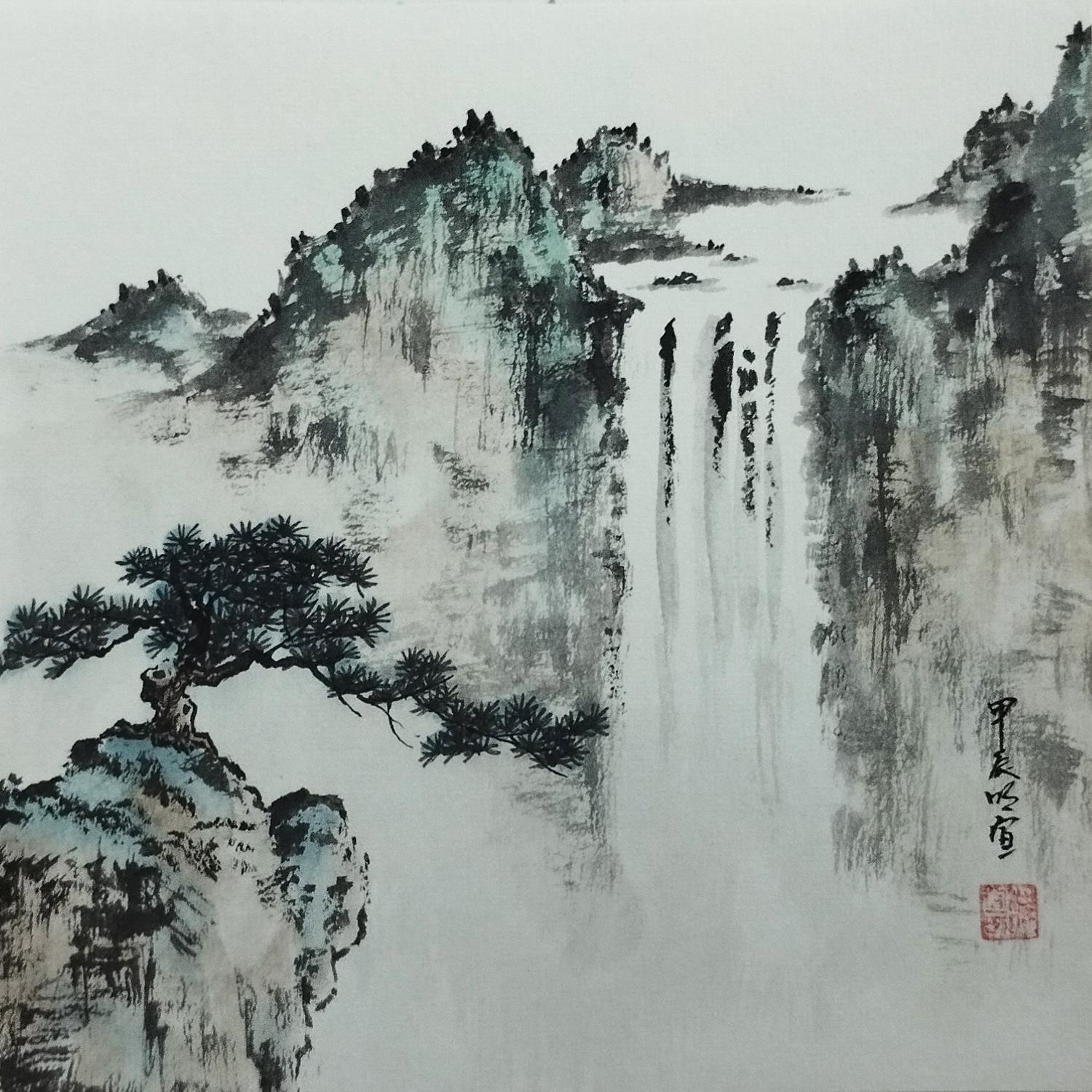 Cette oeuvre d'art contemporain unique et originale "Pine tree and waterfall" a été réalisée par l'artiste contemporain Du Mingxuan.