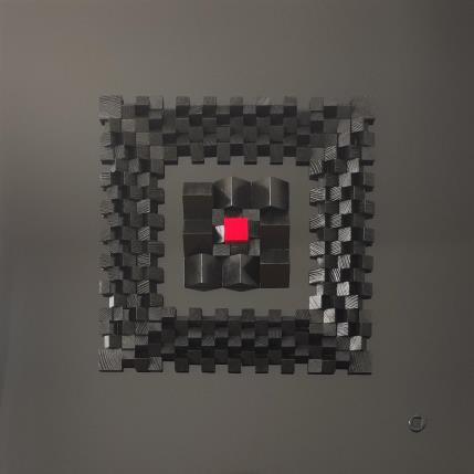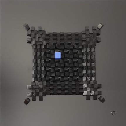 Son travail repose sur la réflexion de la lumière sur différents supports et matières, tels que la feuille de cuivre dorée, et la gamme chromatique des noirs appliquée sur des cubes en bois, coupés en biais.