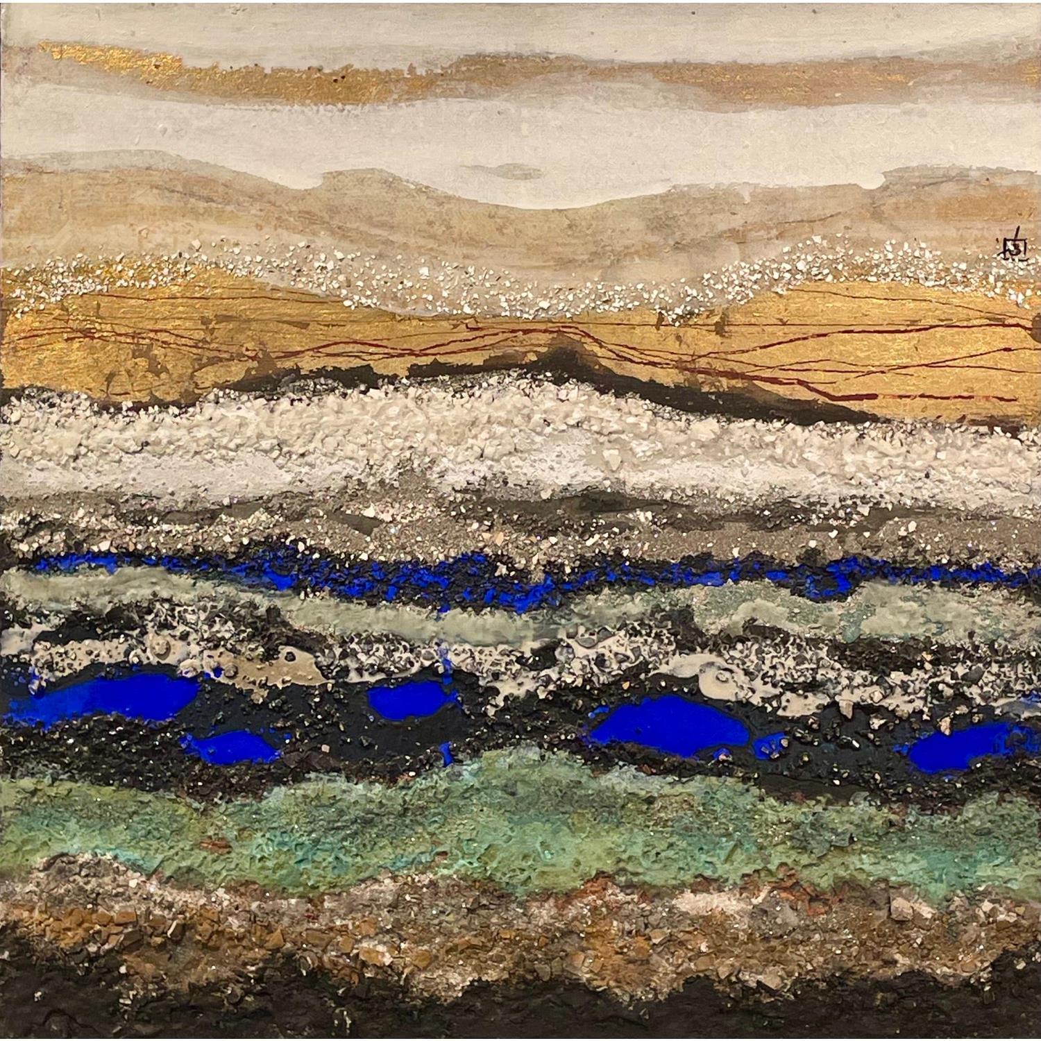 L'artiste a utilisé les techniques Acrylique, Feuille d'or pour créer cette peinture grand format sur Carton toilé de style Abstrait.
