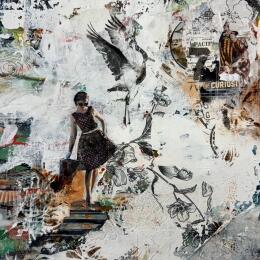 L'artiste a utilisé les techniques mixtes: collages, textures, tissus, pastels et la peinture acrylique, pour créer cette peinture petit format sur toile souple de style abstrait, surréaliste.