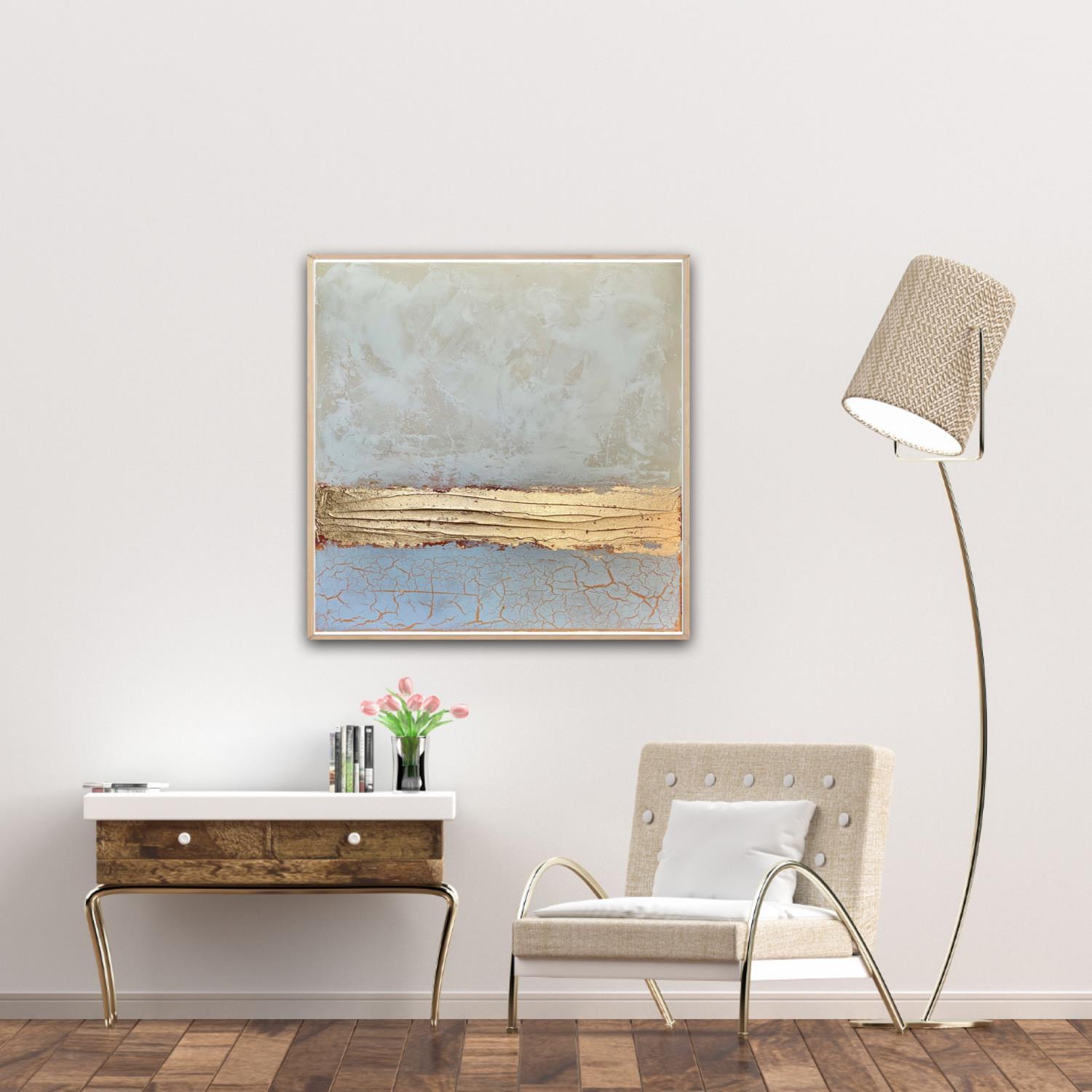 Textures, feuilles métalliques doréées rose et craquelures contrastent avec des couleurs neutres et douces: gris beige en haut et gris craquelé laissant apparaitre un fond couleur rouille Les dorures illuminent le tableau et la pièce dans laquelle le tableau se trouve, cette lumière est tres changeante suivant les heures du jour et l'emplacement de celui qui regarde cela fait que vous avez mille tableaux en UN.
