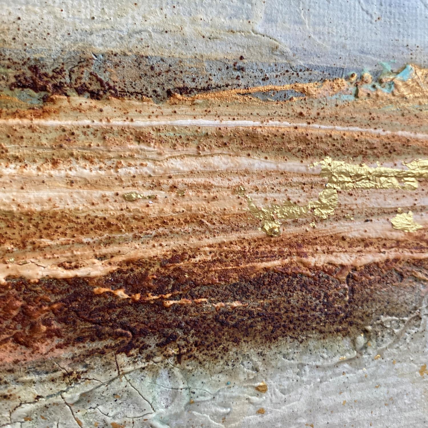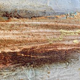 Travailleuse acharnée et passionnée, elle nous entraîne à travers ses mélanges de pigments dans un monde minéral et brut. Ses couleurs métalliques, dorées, cuivrées, rouillées, s’organisent dans un rendu fissuré, craquelé et accidenté, rempli de délicatesse, de poésie et de sérénité.