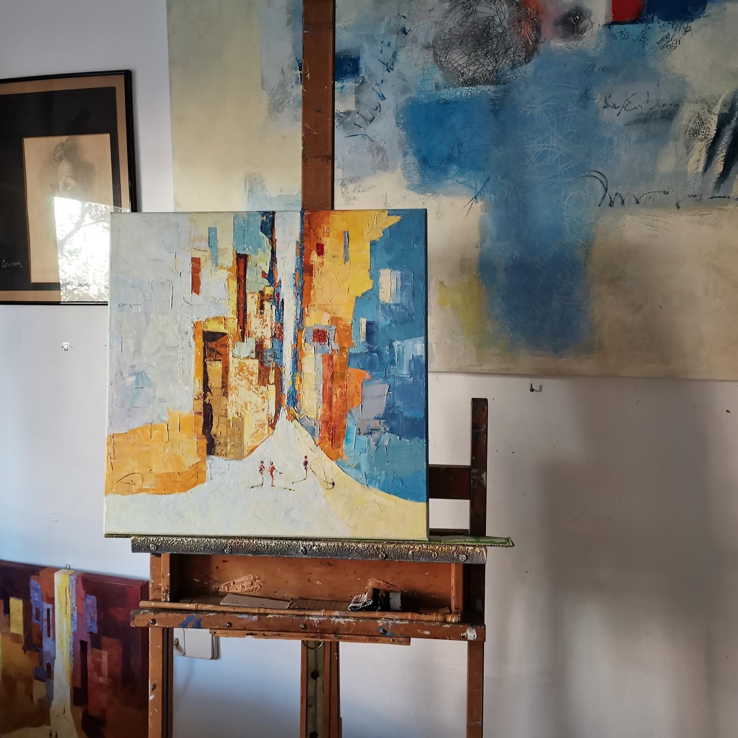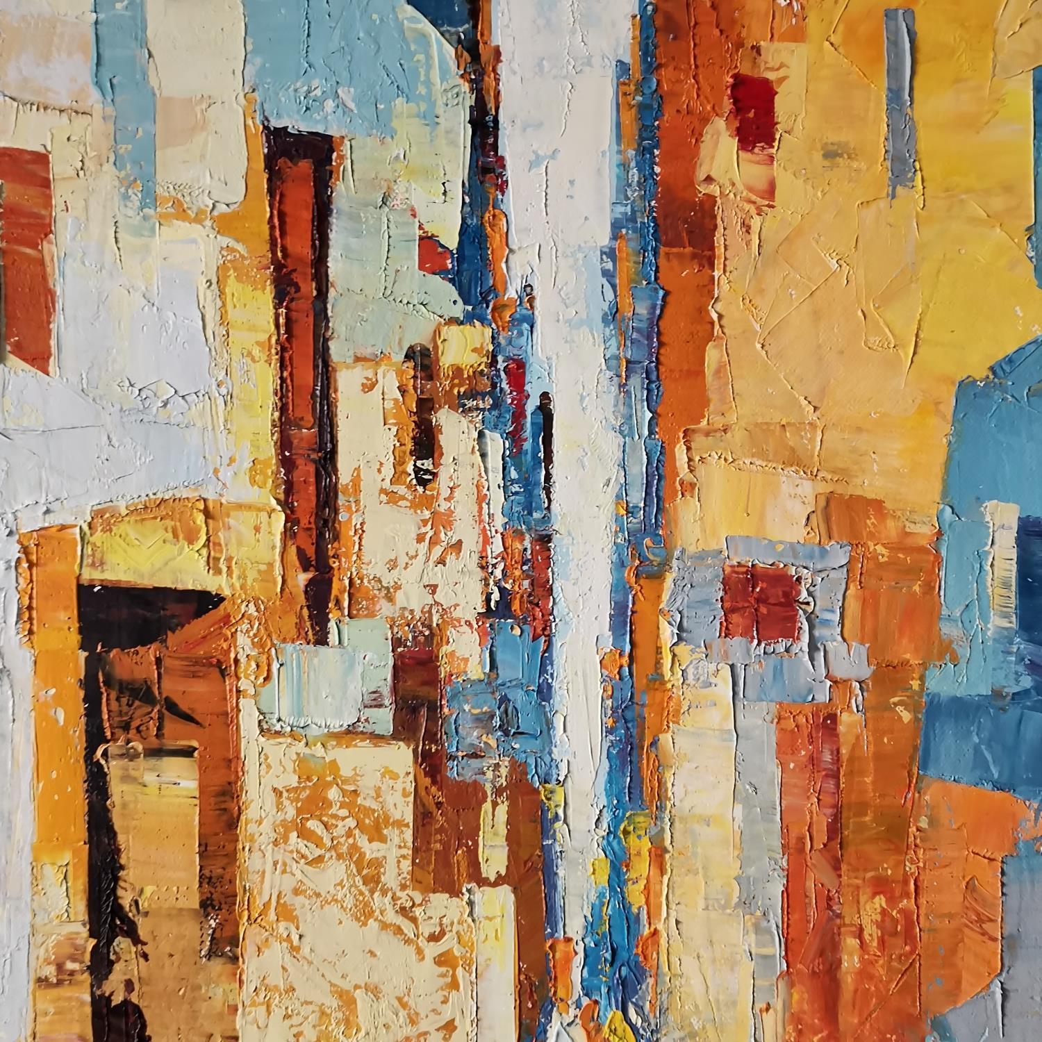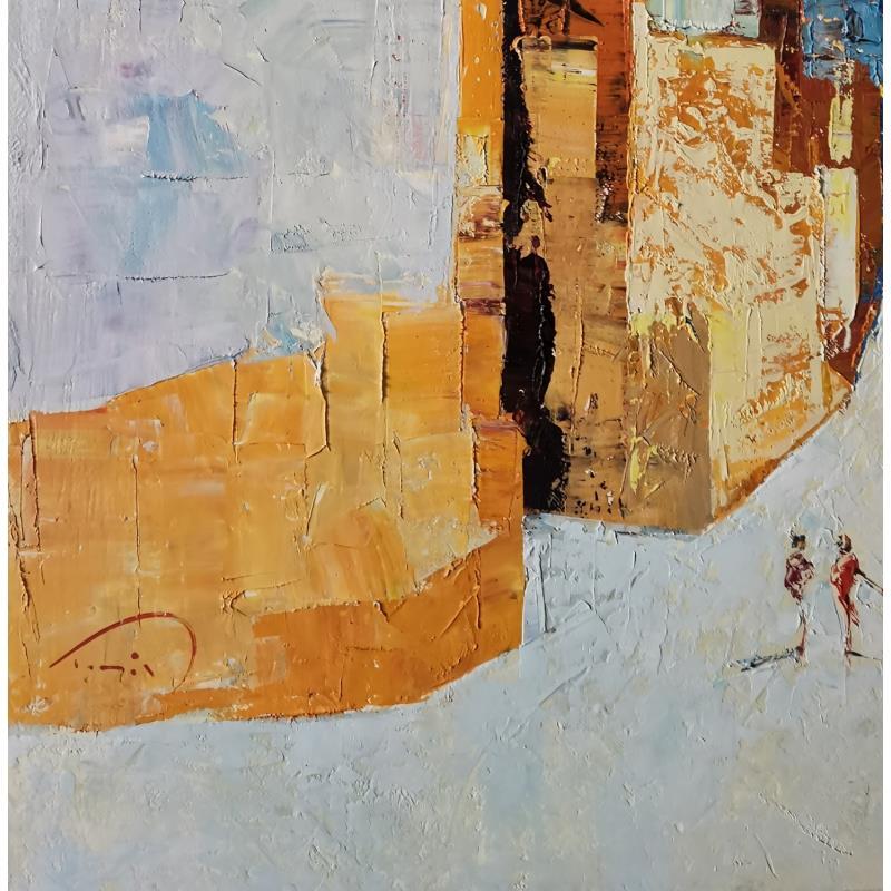 L'artiste a utilisé la technique Huile pour créer cette peinture grand format sur Toile de style Abstrait sur les thèmes Scènes de vie, Urbain.